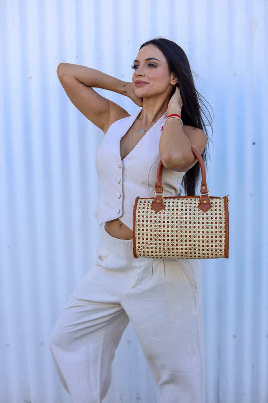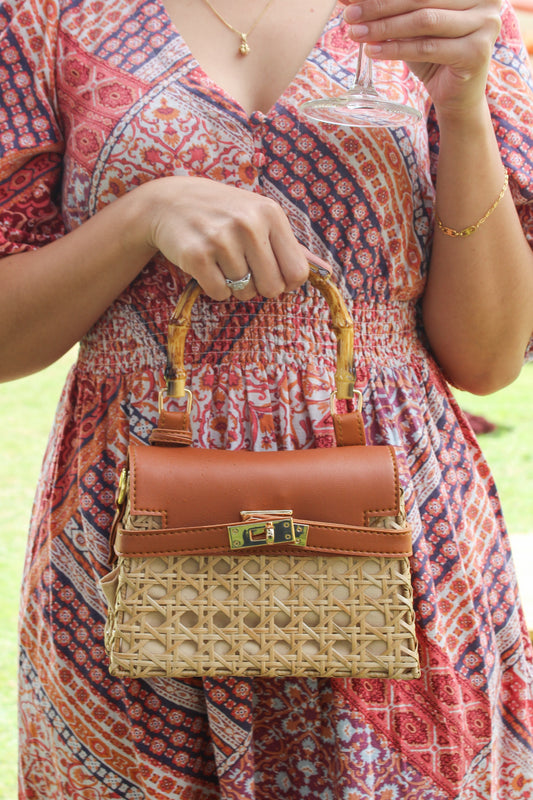 Maria | Rattan Handbag (Brown, Caramel & Gold) | The Pino Collection